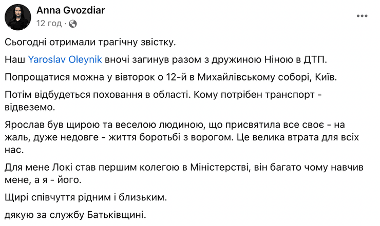 "Сегодня получили трагическую весть. Наш Ярослав Олейник ночью погиб вместе с женой Ниной в ДТП", — написала Анна Гвоздяр вечером 8 сентября.