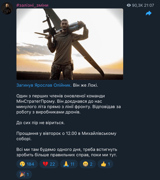 "Погиб Ярослав Олейник. Он же "Локи". Один из первых членов обновленной команды МинСтратегПрома. Он присоединился к нам прошлым летом прямо с линии фронта. Отвечал за работу с производителями дронов", — отметил он.