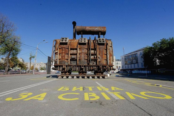Инсталляция включает в себя разрушенный Россией силовой трансформатор, который работал на одной из теплоэлектростанций ДТЭК.
