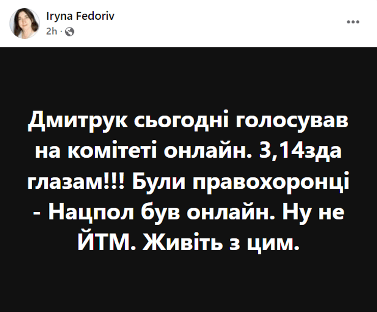 "Дмитрук сегодня голосовал на комитете онлайн. 3,14зда глазам!!! Были правоохранители — Нацпол был онлайн... Ну не ЙТМ. Живите с этим", — написала Федорив.