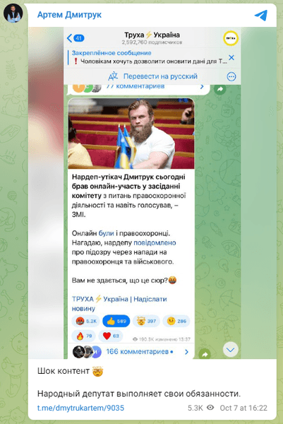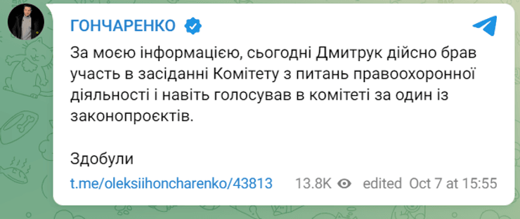 "По моей информации, сегодня Дмитрук действительно участвовал в заседании Комитета по вопросам правоохранительной деятельности и даже голосовал в комитете за один из законопроектов. Получили", — написал он.