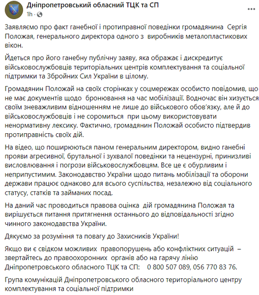 "Гражданин Положай на своих страницах в соцсетях лично сообщил, что не имеет документов по бронированию на время мобилизации. В то же время он хвастается своим пренебрежительным отношением не только к воинскому долгу, но и к военнослужащим и не стесняется при этом использовать ненормативную лексику. Фактически, гражданин Положай лично подтвердил противоправность своих действий", — говорится в заявлении.
