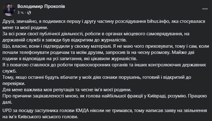 "Я обращаюсь к правоохранительным и антикоррупционным органам проверить факты, изложенные журналистами-расследователями Bihus Info в отношении заместителя председателя КГГА Владимира Прокопива. А также на время проверки, для ее объективности, отстраняю Прокопива от исполнения обязанностей заместителя председателя КГГА по самоуправленческим полномочиям", — написал он в своем телеграм-канале.