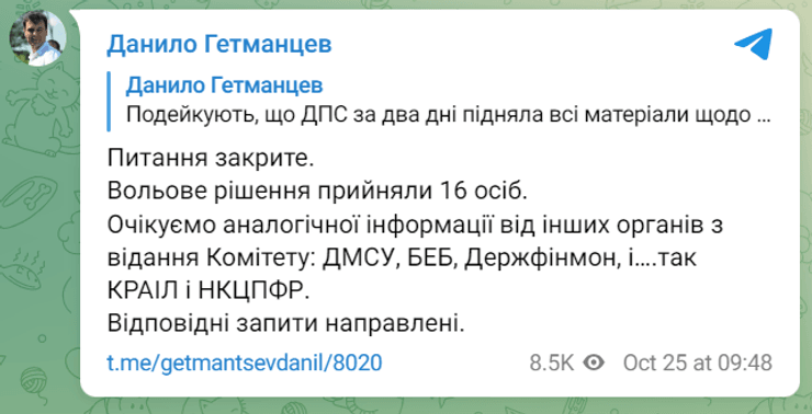 Депутат добавил, что если чиновник, о котором он написал, не уволится, то он обратится к правоохранителям и обнародует его имя. Однако впоследствии Гетманцев сообщил, что "вопрос закрыт" и все 16 должностных лиц оставили службу.