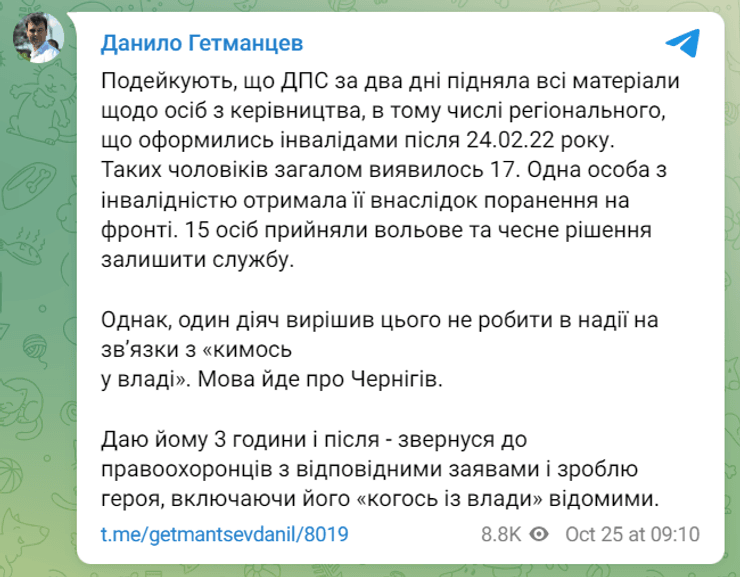 Гетманцев заявил, что 15 из них "приняли волевое и честное решение оставить службу". Однако один чиновник из Чернигова решил этого не делать в надежде на связи с "кем-то во власти".