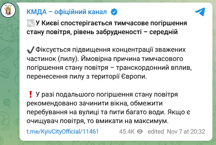 Загрязненный воздух накроет значительную часть территории Украины, но к концу пятницы, 8 ноября, уровень загрязнения начнет снижаться из-за смены направления ветра.