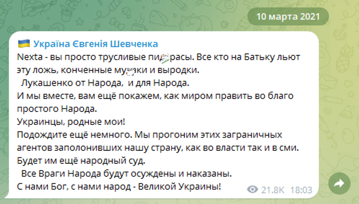 Ранее, в марте 2021 года Шевченко, защищая президента Беларуси Александра Лукашенко, не выбирая выражений обвинял NEXTA во лжи.