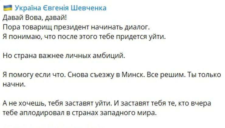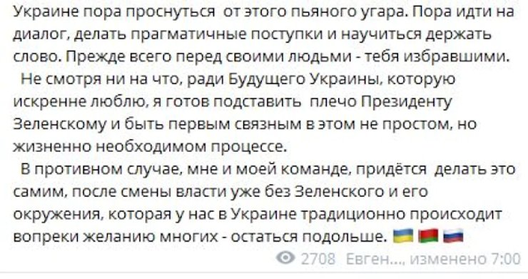Вечером 7 ноября Евгений Шевченко написал, что президент Владимир Зеленский не идет на мирные переговоры с Россией якобы из-за "собственных амбиций" и страха потерять должность.