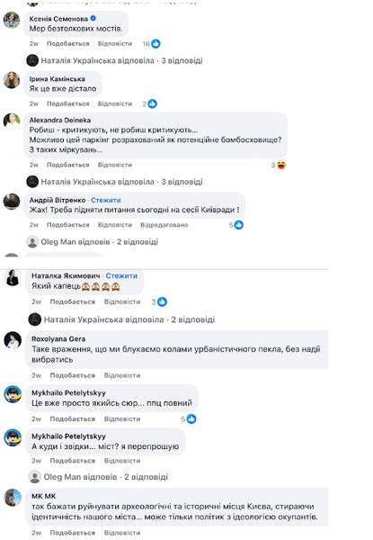 Большинство пользователей негативно отреагировали на новость в комментариях. "Такое впечатление, что мы блуждаем кругами урбанистического ада, без надежды выбраться", — написала одна из комментаторов. Депутат КГГА Ксения Семенова отреагировала на новость так: "Мэр бестолковых мостов". Были и те, кто встал на защиту строительства паркинга: "делаешь — критикуют, не делаешь критикуют... Возможно этот паркинг рассчитан как потенциальное бомбоубежище? Из таких соображений...".
