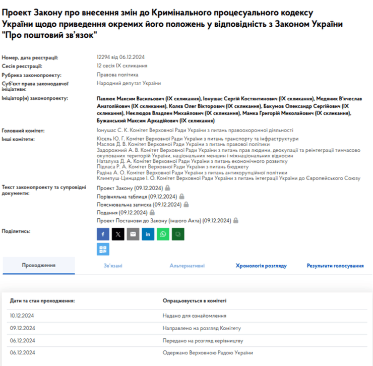 Украинским правоохранителям могут предоставить право без ведома адресата открывать корреспонденцию без ведома адресата. Соответствующий законопроект № 12294 о внесении изменений в Уголовный процессуальный кодекс Украины относительно приведения отдельных его положений в соответствие с Законом Украины "О почтовой связи" подан группой депутатов от политической партии "Слуга народа" и Мамкой Григорием Николаевичем, членом депутатской группы "Платформа за жизнь и мир".