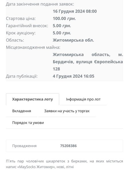 Общая стартовая стоимость лота — 100 гривен, или по 20 гривен за пару. Торги пройдут 16 декабря 2025 года в 9:00 и продлятся до 18:00. Гарантийный взнос объявлен в размере 5 гривен.