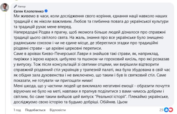 "Именно в архивах Киево-Печерской Лавры я нашел такие блюда, как, например, пирожки с икрой карася, луком и пшеном или гороховый кисель, о которых рассказал в выпуске. Поэтому после консультаций со святыми отцами, мы решили воссоздать настоящий рождественский стол украинцев в трапезной палате, которая была построена в свое время как обеденный зал духовенства и не исключено, что таким и был их праздничный стол. Именно показать, не готовить или угощать ими", — написал он.