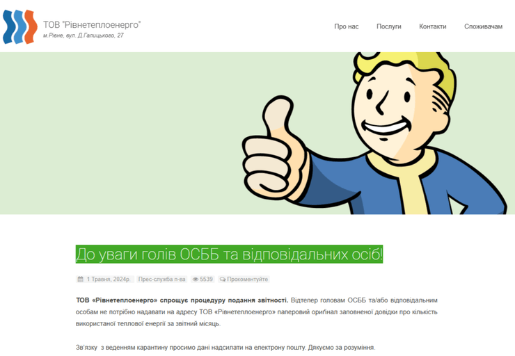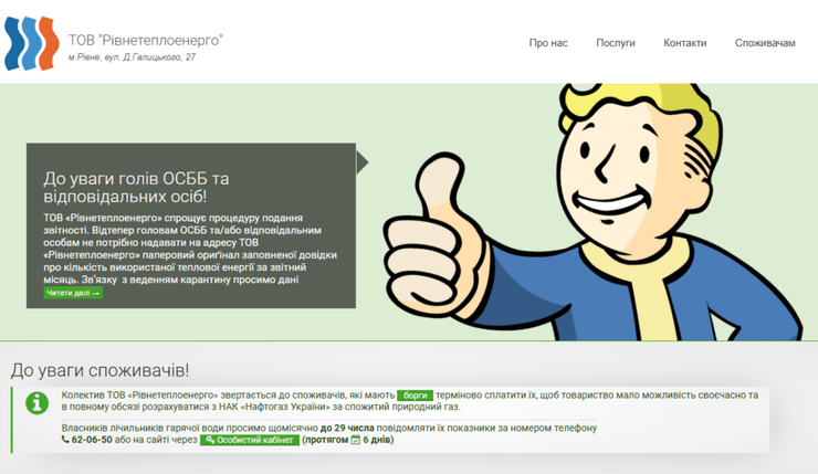 Fallout для местных ОСМД: "Ривнетеплоэнерго" использовало на сайте персонажа из известной игры