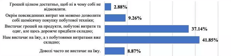 Согласно проведенному исследованию материальное состояние многих граждан остается довольно сложным: 9.3% опрошенных отметили, что им не хватает средств даже на еду. Почти 42% сообщили, что средств хватает только на продукты питания, но бытовые расходы являются серьезной проблемой. Еще 37% респондентов имеют достаточно денег на еду и бытовые расходы, но не могут позволить себе крупных покупок. И только 2,9% украинцев отметили, что их финансовое состояние позволяет жить без ограничений.