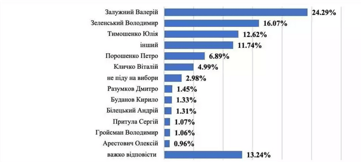 Политические предпочтения украинцев также претерпели некоторые изменения. Лидером президентских рейтингов в настоящее время является Валерий Залужный с поддержкой 24.29%. На втором месте — Владимир Зеленский – 16.07%, а на третьем Юлия Тимошенко, которую поддерживают 12.62% респондентов. При этом Владимир Зеленский и Юлия Тимошенко по сравнению с опросом, проведенным в марте 2024 года, добавили 5.44% и 5.55% соответственно, а симпатии респондентов к Валерию Залужному напротив уменьшились почти на 4%.