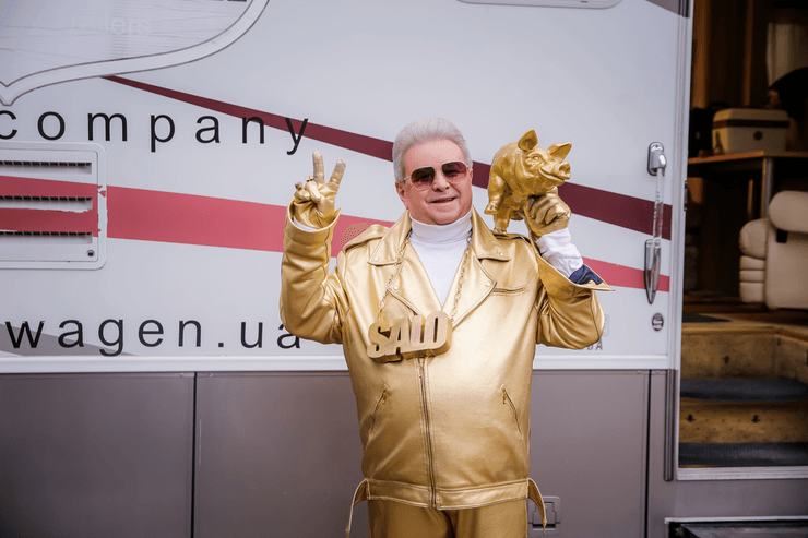 По нестандартному режиссерскому замыслу, сало превращается в золотые слитки. А Михаил Поплавский предстает в стильном образе главного "саломана" страны.