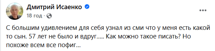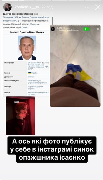 Также журналист утверждал, что один из молодых людей — сын Дмитрия Исаенко, народного депутата от запрещенной ОПЗЖ, которому в 2023 году сообщили подозрение в попытке завладения земельным участком площадью 8 га в Киеве.