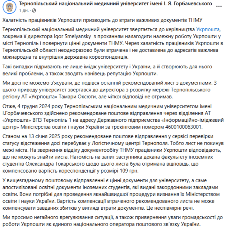 В одном из отделений акционерного общества "Укрпошта" города Тернополь потеряли письмо с ценными документами, предоставив компенсацию в размере 109 гривен. Об этом говорится на Facebook-странице Тернопольского национального медицинского университета имени И. Я. Горбачевского.