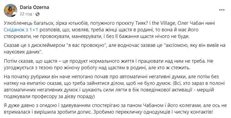 Медицинская журналистка, биолог Дарья Озерная после эфира раскритиковала психиатра, который заявил, что если женщине нужно счастье в семье, то она и должна его создавать. Она добавила, что давно с отвращением и удивлением наблюдает за Олегом Чабаном и его коллегами.