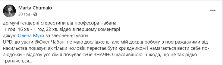 Заместитель председателя Центра "Женские перспективы" Марта Чумало также считает его слова "дремучими гендерными стереотипами". Учитывая свой опыт работы с пострадавшими от насилия, она отметила, что как только мужчина перестает быть обидчиком — вся семья сразу чувствует себя значительно счастливее.