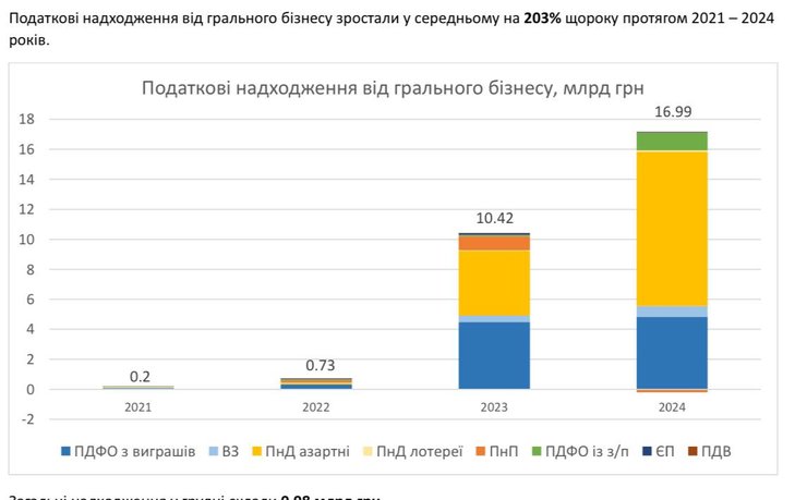 В течение 2024 года игорный бизнес уплатил в бюджет 16,99 млрд гривен налогов против 10,4 млрд в 2023-м.