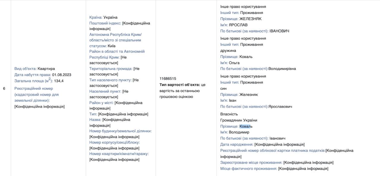 Напомним, в августе 2023 года народный депутат Ярослав Железняк вместе с женой, депутатом Ольгой Коваль поселились в квартире в центре Киева, стоимость которой составляет около 12 миллионов гривен. Эта квартира площадью 134 квадратных метра расположена на Печерске и записана на Владимира Коваля — тестя Железняка и отца Коваль.