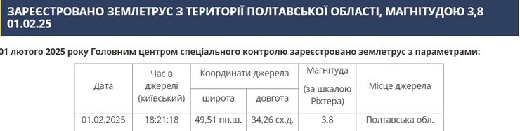 1 февраля обернулось для Полтавы не только трагедией в виде разрушенного российской ракетой подъезда пятиэтажного жилого дома, где уже нашли восемь погибших, в том числе и ребенка, но и землетрясением. В 18:25 жители города в местных чатах начали писать, что почувствовали землетрясение. Спустя час информацию официально подтвердил Главный центр специального контроля.
