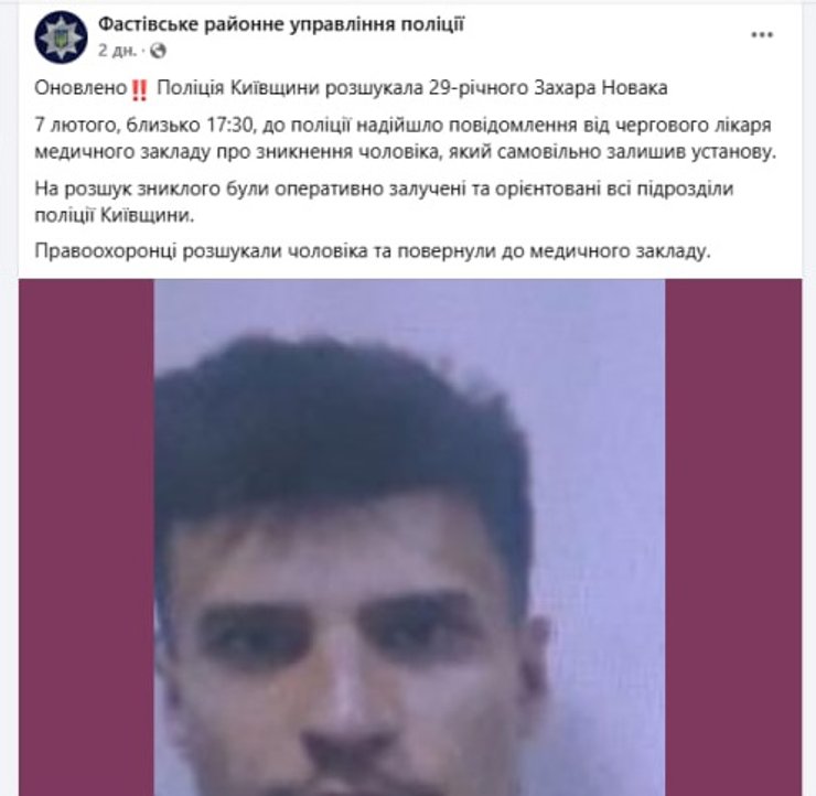 "7 февраля, около 17:30, в полицию поступило сообщение от дежурного врача медицинского учреждения об исчезновении мужчины, который самовольно покинул учреждение. На розыск пропавшего были оперативно привлечены и ориентированы все подразделения полиции Киевщины", — говорится в сообщении.