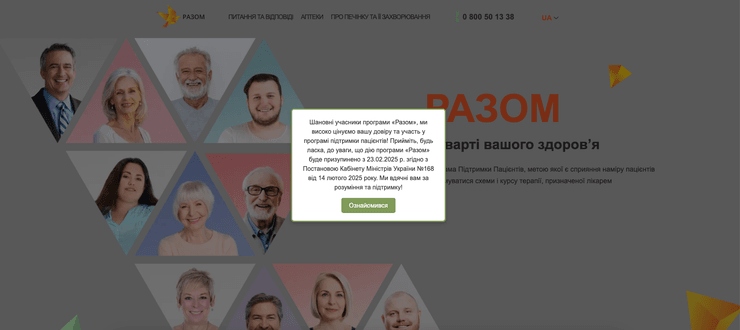 Программа поддержки пациентов "Разом" была создана по инициативе международной фармацевтической компании "Abbott" (США) и медицинских Ассоциаций (Украинской Гастроэнтерологической Ассоциации, Украинской Ассоциации Семейной Медицины и Ассоциации Инфекционистов Украины). Ее целью было содействие непрерывному лечению пациентов с заболеваниями печени, обеспечивая им персональную 30% скидку на препараты, включенные в Программу.