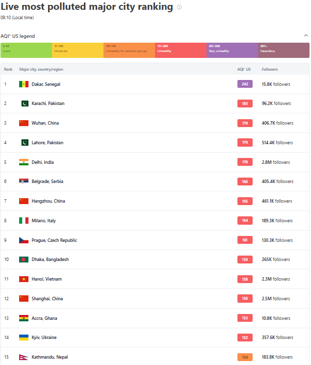 По данным IQAir, по состоянию на 09:10 Киев занимает 14 место среди самых загрязненных городов в мире по состоянию воздуха.