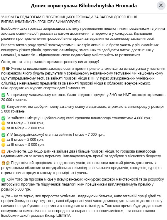 Сообщение с рекордными суммами за достижения школьников и учителей появилось в сети утром 25 февраля. В последнем абзаце приводятся слова главы громады Виктора Шепеты, который сказал, что деньги — это "символическое вознаграждение за старания и настойчивость". Лучшие ученики будут получать от 2 до 20 тыс. грн за различные достижения. Самая большая сумма за максимальный балл на НМТ. Наименьшая — за третье место на олимпиаде областного уровня.
