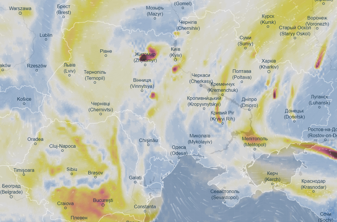 Напомним, в феврале Ventusky уже прогнозировал пылевую бурю, которая двигалась из Польши, Сербии и Болгарии в Украину. Самый высокий уровень загрязнения тогда также ожидался в Житомире.