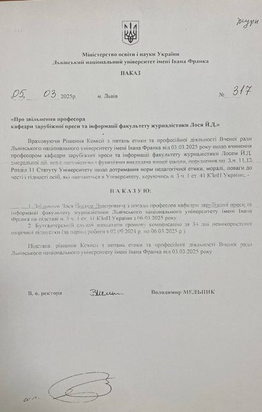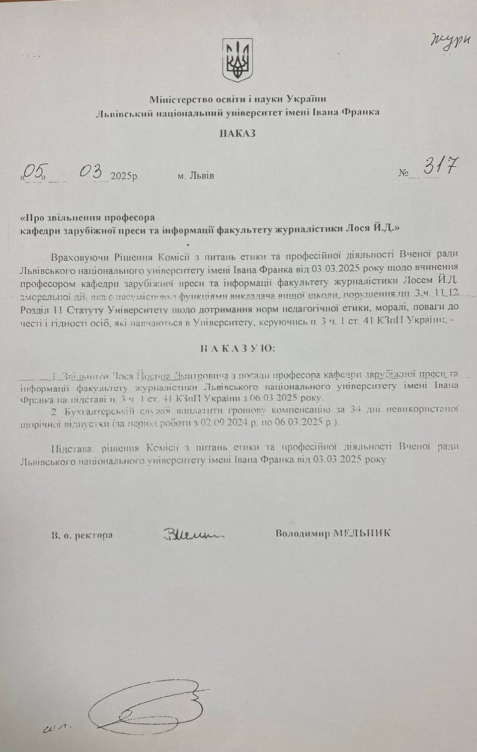 До увольнения в учреждении высшего образования собирали заседание Комиссии по вопросам этики и профессиональной деятельности Львовского национального университета имени Ивана Франко. На нем ректору предложили уволить Иосифа Лося.