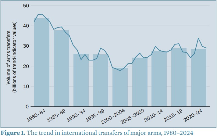 В бюллетене также разместили инфографику с тенденциями рынка оружия с 1980 (когда продолжалась "Холодная война" США и СССР) по 2024 год. График показывает, что объемы 2024 года доросли до уровня 1990–94 гг., когда упала Берлинская стена и завершилась "Холодная война". До пиков начала 90-х гг. — еще около 12 пунктов.