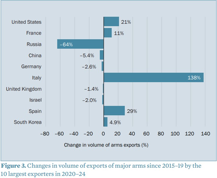 Аналитики также рассказали, что доля экспорта США выросла на 43%, в то время как РФ потеряла 64%. На инфографике SIPRI видно еще одну страну, которая существенно нарастила продажу оружия — это Италия.