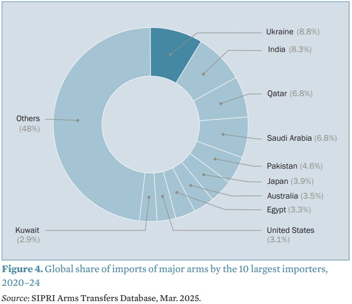 На инфографике, созданной SIPRI, можно увидеть, что Украина занимает 8,8% от мирового импорта оружия. Ближайший соперник, Индия, отстает на полпроцента — 8,5%. Например, Пакистан покупает вдвое меньше (4,6%), а США — почти в три раза меньше (3,1%).