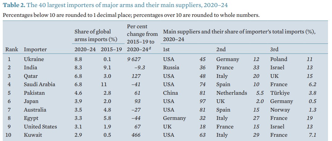 В бюллетене под названием "Trends in international arms transfers, 2024" собрана информация о тенденциях рынка оружия — экспорт и импорт разных стран, изменения на рынке, смена лидеров и тому подобное. При этом данные за 2020–24 гг. сравниваются с 2015–19 гг. и даже с 1980-84 гг. Аналитики написали, что Украина по состоянию на 2024 год является лидером по импорту вооружения — есть рост в 100 раз.