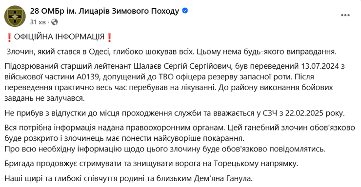 "Это позорное преступление обязательно будет раскрыто и преступник должен понести суровое наказание", — говорится в сообщении 28 ОМБр, которая продолжает сдерживать и уничтожать врага на Торецком направлении.
