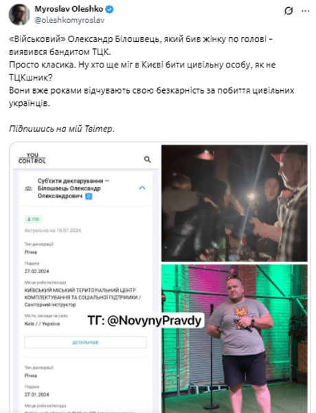После скандала с избиением военного в Киеве из-за замечания, которое он сделал компании, слушавшей русскую музыку, в сети распространилась информация, что якобы человеком, который "ударил женщину по голове" и сам пострадал в столкновении, является работник ТЦК Александр Белошвец. В ведомстве прокомментировали эти данные.