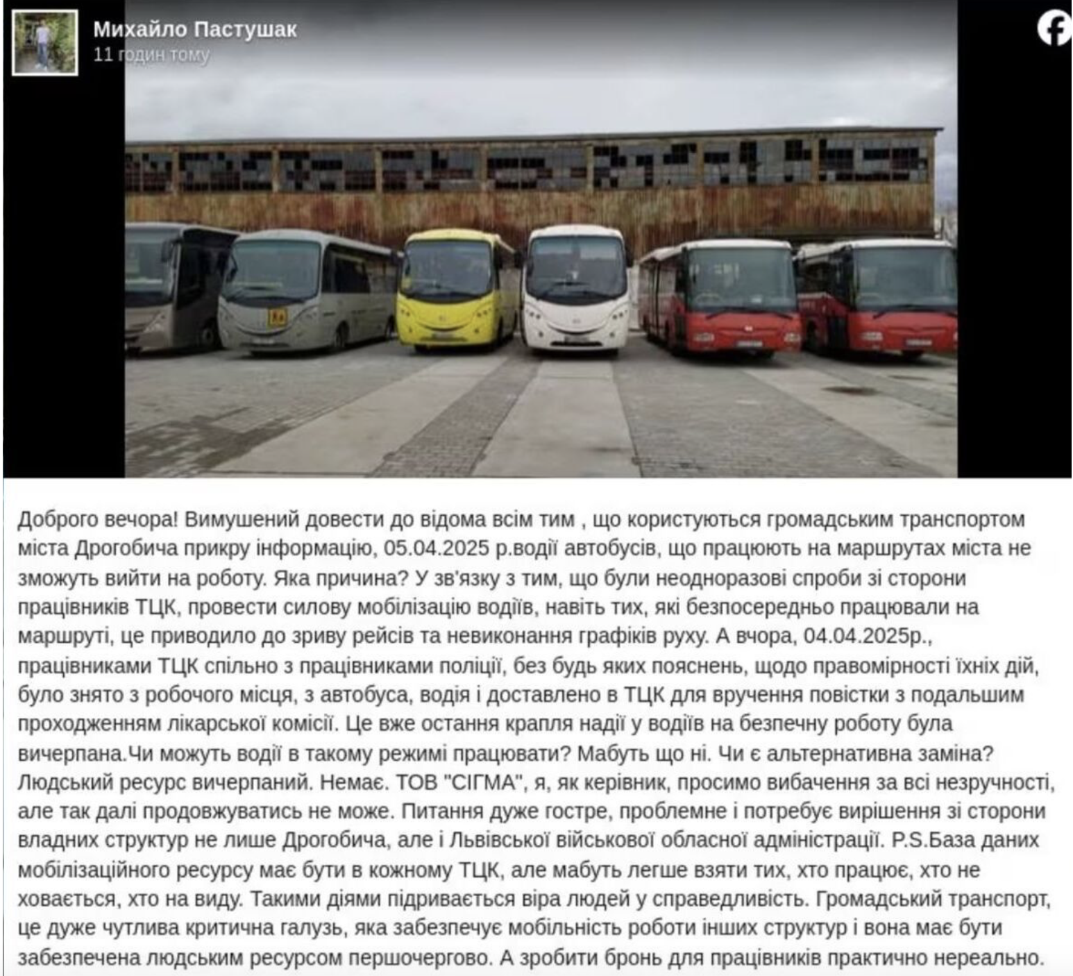Руководитель ООО "Сигма", которое занимается пассажирскими перевозками в Дрогобыче, Михаил Пастушак написал, что 5 апреля водители автобусов не смогут выйти на маршруты из-за "неоднократных попыток со стороны работников ТЦК провести силовую мобилизацию".