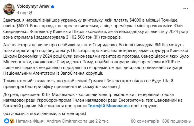8 апреля народный депутат Владимир Арьев написал в посте на Facebook, что Юлия Свириденко в Киевской школе экономики за преподавательскую деятельность в 2024 году получила и задекларировала 3 102 506 грн гонораров.