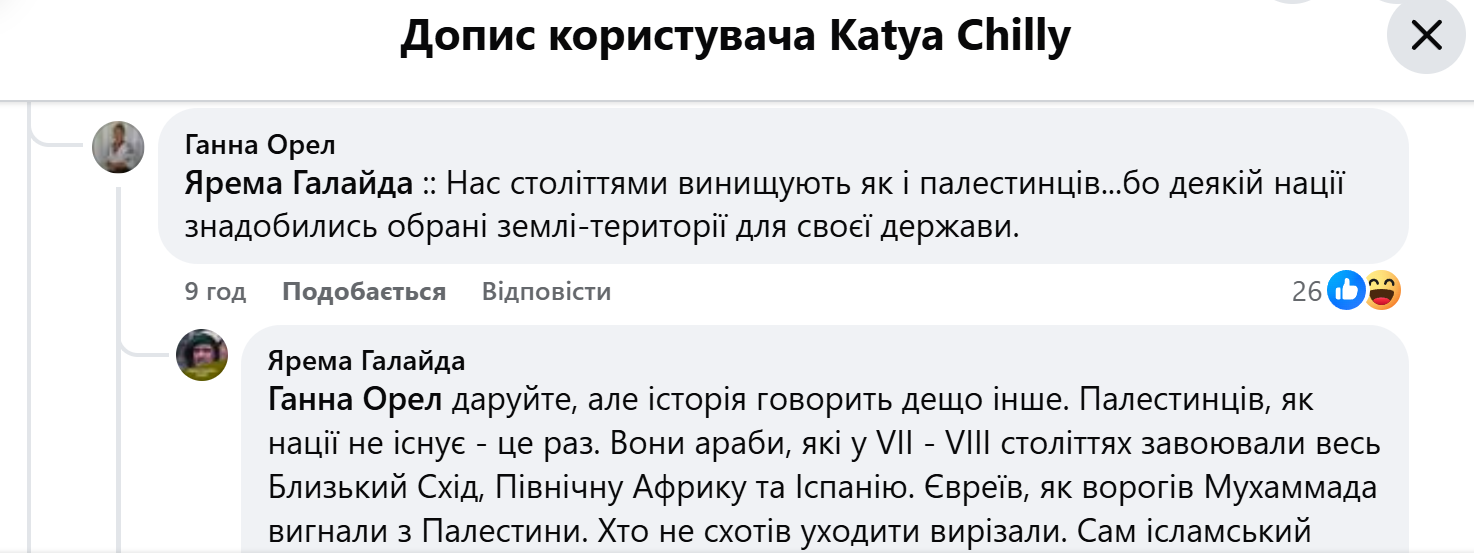 Некоторые писали, что украинцев истребляли веками так же как и палестинцев. Это связано с тем, что "некоторой нации понадобились избранные земли-территории для своего государства".