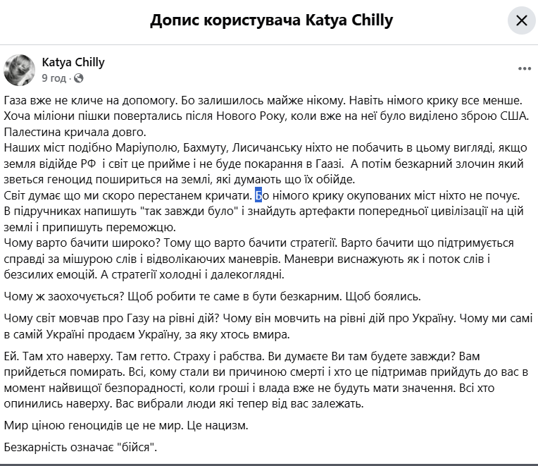 В посте Катя Чили задает вопрос, почему мир молчал о Секторе Газа и почему он молчит об Украине. Она добавила, что мир ценой геноцидов — это не мир, а "это нацизм".