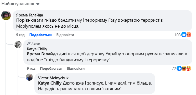 Сообщение набрало несколько сотен реакций и комментариев. Некоторые отмечали, что невозможно "сравнивать гнездо бандитизма и терроризма Газу с жертвой террористов Мариуполем". Певица ответила, что Украину тоже могут записать "в подобное "гнездо бандитизма и терроризма".