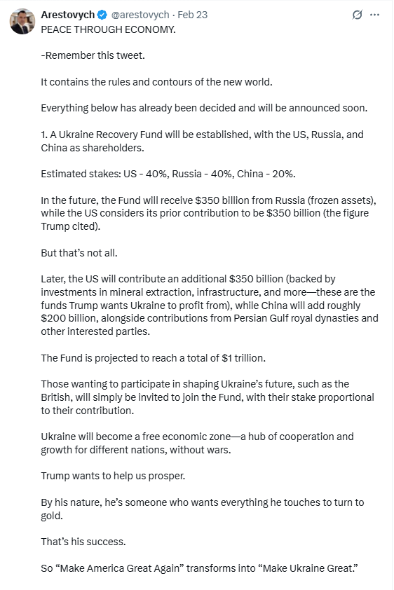 Первый англоязычный пост описывает видение Арестовичем будущего Украины, в котором нарративы кремлевской пропаганды сочетаются с положительными отзывами о деятельности президента США Дональда Трампа. Также он пишет о "триллионе долларов", которые получит Украина от США, Китая и России для послевоенного восстановления.