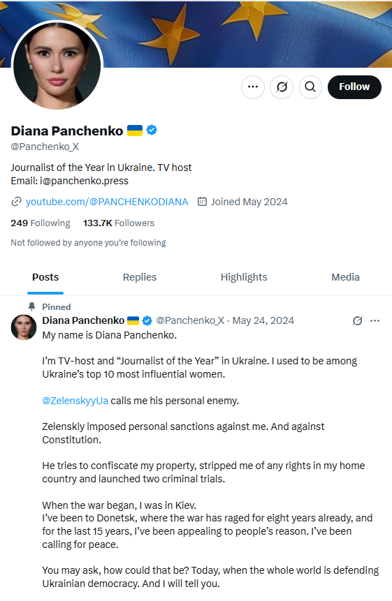 В профиле Дианы Панченко закреплен похожий пост, в котором она обвиняет украинские власти в преследовании.