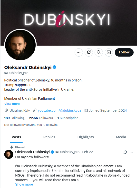 Он регулярно тегает под своими сообщениями Дональда Трампа, Илона Маска, чиновников администрации США, блогеров-трампистов и российских пропагандистов. Трамписты и пропагандисты РФ взамен начали писать о Дубинском как "жертве режима Зеленского" и формировать образ "узника совести".