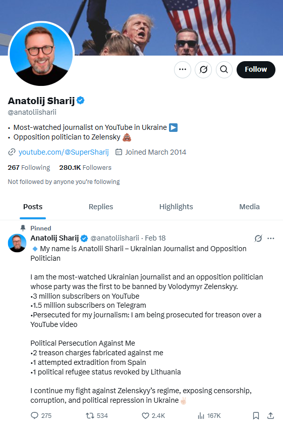 В аккаунте Шария в сети Х закреплено сообщение, в котором он называет себя оппозиционным политиком, которого власть преследует за журналистскую работу.