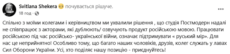 "Работать на русском во время российско-украинской войны, означает поддерживать "русский мир", — написала режиссер дубляжа киностудии Светлана Шекера, отметив, что это "неприемлемо".