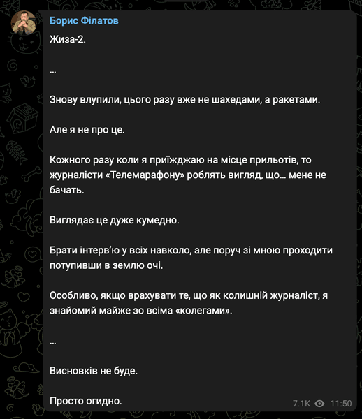 "Опять влупили, на этот раз уже не шахедами, а ракетами. Но я не об этом", — отметил Филатов.